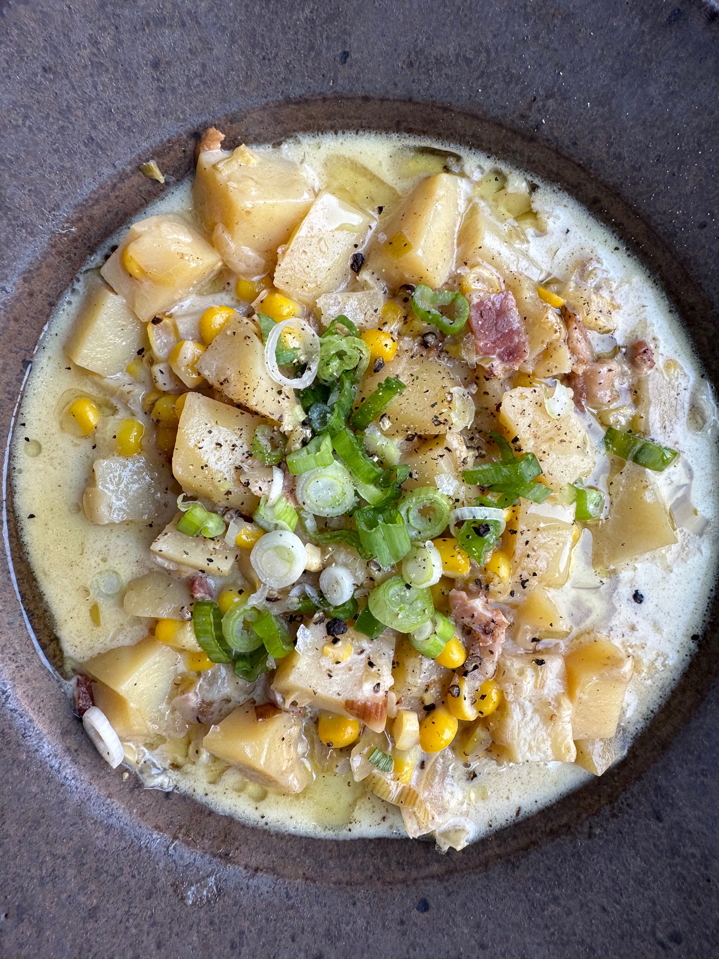 I ladled the chowder into ceramic bowls I’d brought back from Japan in my hand luggage. It made a humble bowl of soup feel special. Consider this your reminder to use your “good crockery.” Don’t wait. Life’s too short. If it breaks, it breaks. One of mine actually did chip as I clumsily knocked it. I swore at myself, then gathered the pieces to Kintsugi and embraced the imperfection and resilience of this bowl’s journey with me.